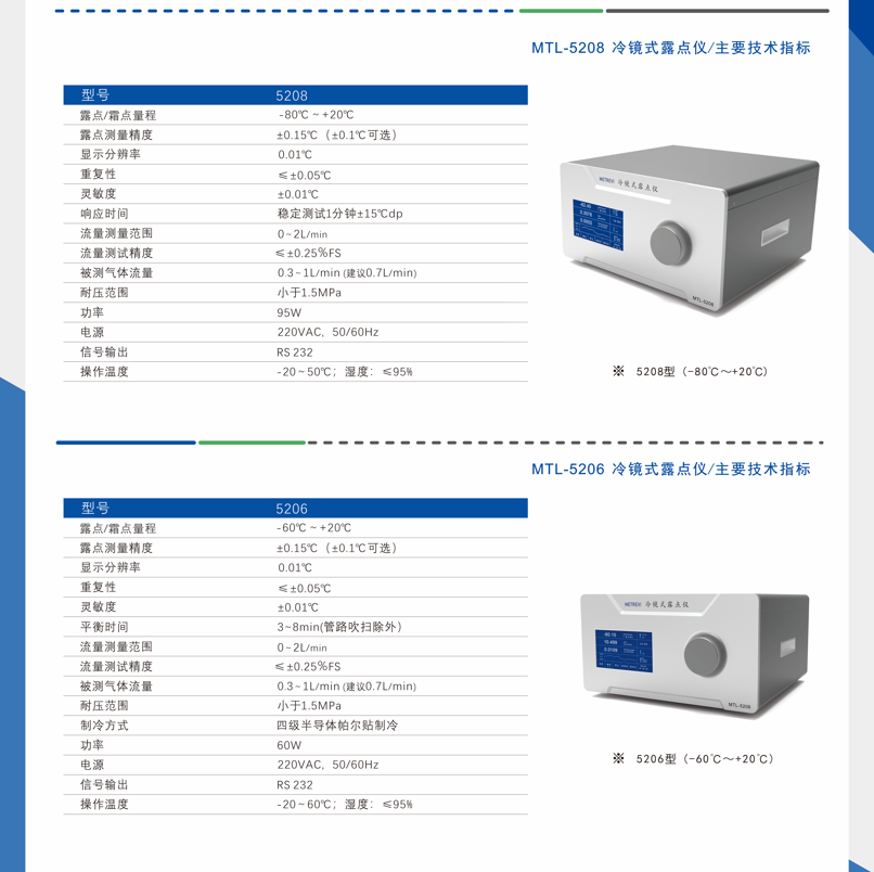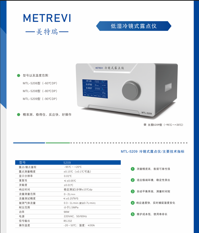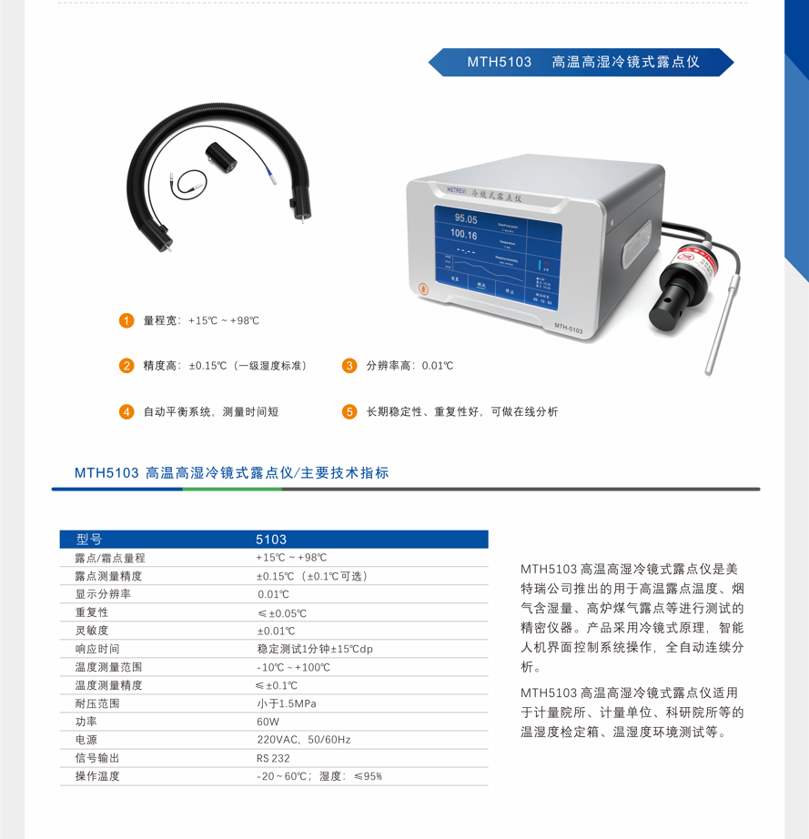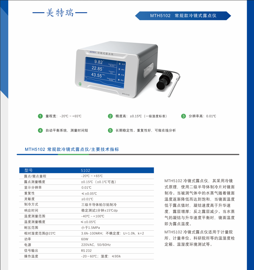 高精度冷镜式露点仪: 高精度冷镜式露点仪测量范围覆盖-95℃ dp ~ +98℃ dp ,≤±0.1℃ dp的测量精度,满足了从超低露点到高温露点的各种严苛测量需求。其稳定可靠的性能,在天然气、半导体、电力、航空航天等领域具有不可替代的应用价值,获得了与会专家的高度认可。